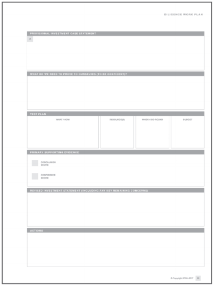 - Frameworks for measuring the strength of the diligence findings and the investment thesis