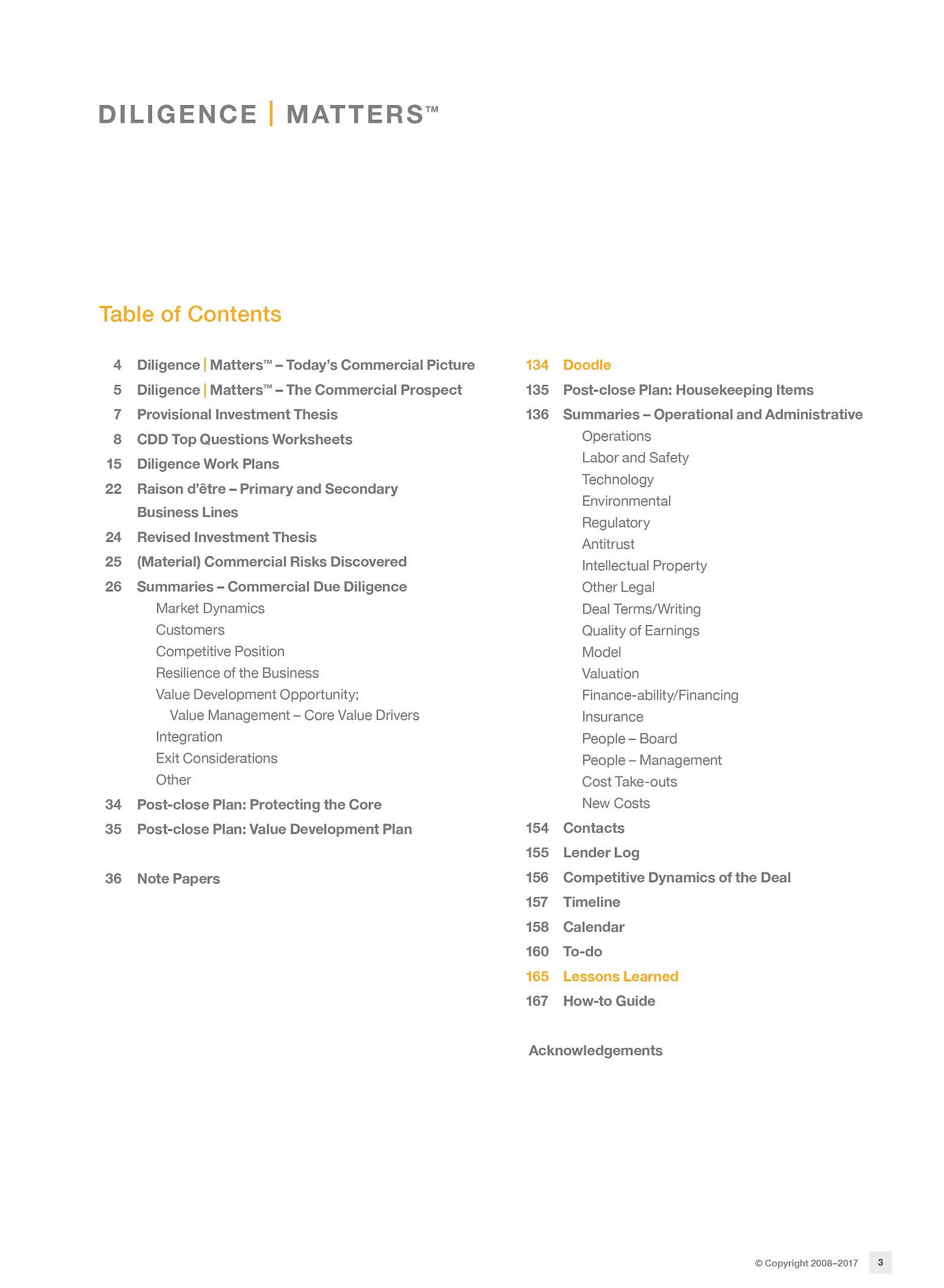 We included a section to record lessons learned to support the continuous improvement of your commercial due diligence work. Within each deal, you might seek to institutionalize learnings on best practice diligence lessons, business model lessons, deal-making lessons, and market and industry lessons. Continuously refine what works, and eradicate costly errors