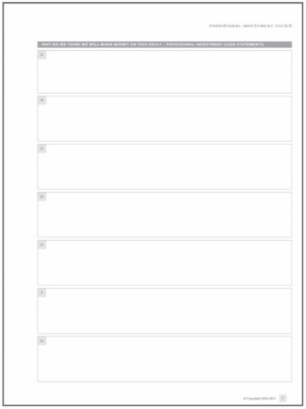Use these pages to develop distinct work streams for each individual investment case statement – and to track results, actions, and revisions to the provisional thesis