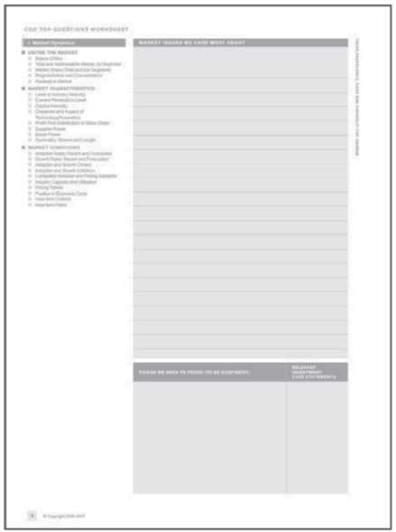 The Top Questions Worksheets help prepare for meetings, and the bottom table ties your questions back to the investment thesis to ensure complete coverage of the thesis