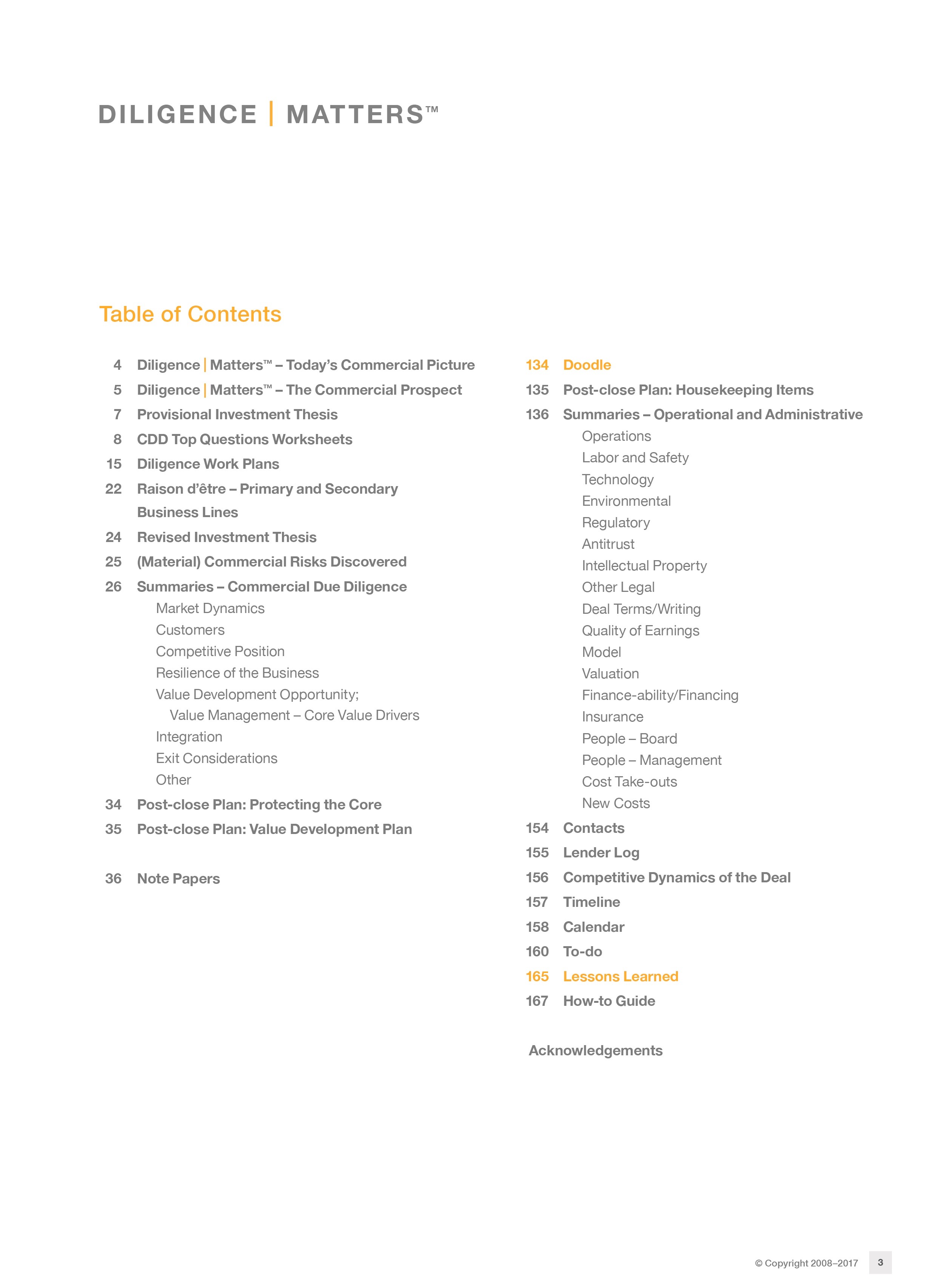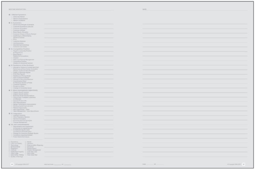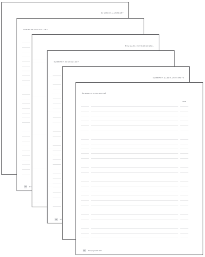 - One set of summary pages is located just before the day-to-day note-taking pages: Raison d’être; Material Commercial Risks Discovered; Commercial Diligence Matters topics I-VII; and summary pages for post-close actions in both Protecting the Core and Value Development