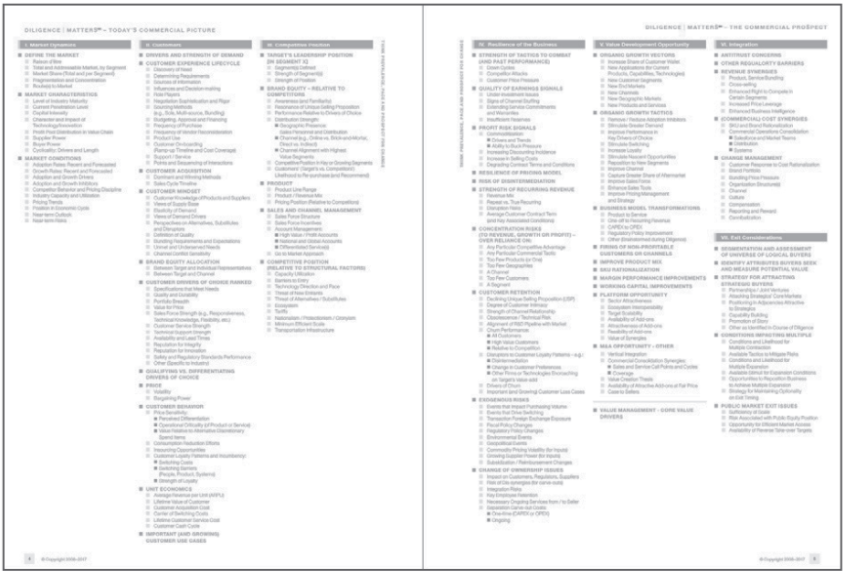 Diligence Matters® starts with a comprehensive commercial due diligence issue list that can be used to prepare for – and stimulate thinking during – your investigations and meetings (e.g., with the members of the target company, with the channel, with customers, with your internal deal team, the investment committee, etc.). The remainder of the tools are designed to help you build the thesis and set the diligence agenda, recognize patterns and discern the most significant takeaways, organize your activities and track progress, and develop a value generation plan and other pre- and post-close action plans.