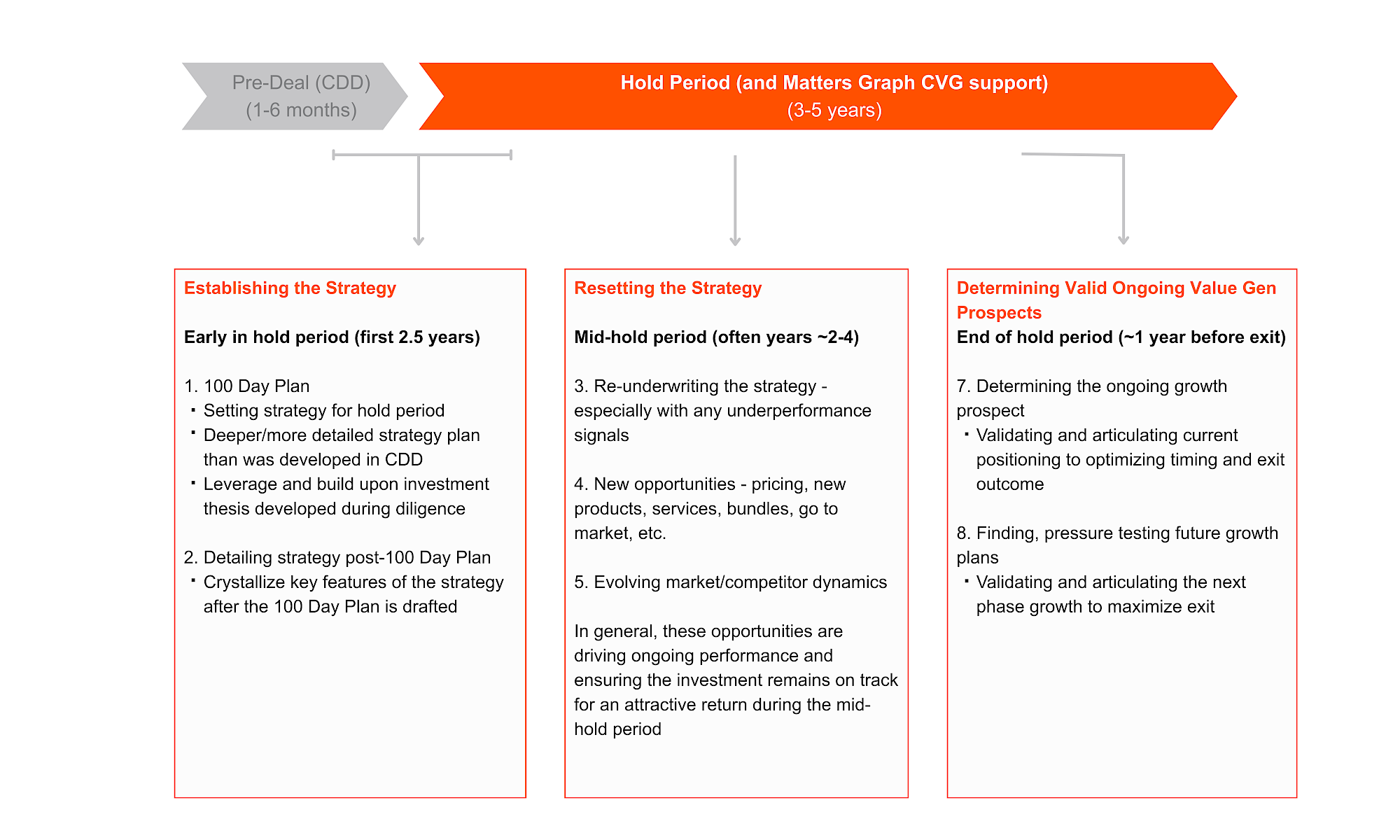 At the end of the hold period—often about a year before exit—CVG shifts its focus from articulating what it can achieve during the current hold period to what it can accomplish, including in the next one. While Matters Graph does not conduct sell-side work (see our Differentiators [here]), we do support Management in their planning activities for future growth, and in building a genuine and credible business case and plan for the next leg of success, which often includes: